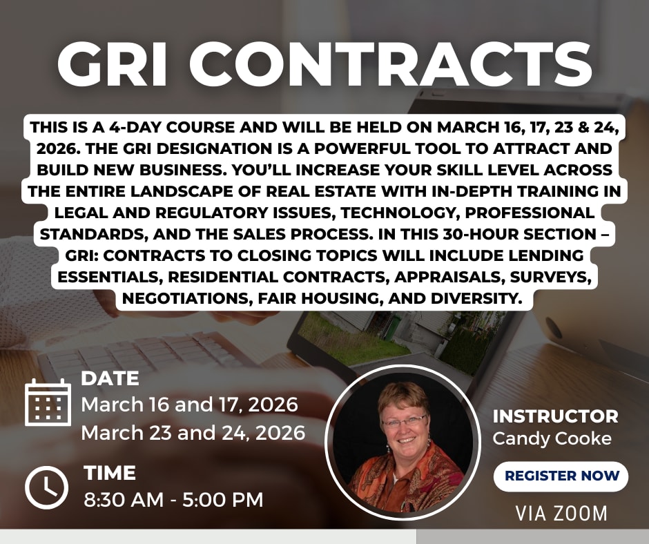 This is a 4-day Course and will be held on March 16, 17, 23 & 24, 2026. The GRI designation is a powerful tool to attract and build new business. You’ll increase your skill level across the entire landscape of real estate with in-depth training in legal and regulatory issues, technology, professional standards, and the sales process. In this 30-hour section – GRI: Contracts to Closing Topics will include lending essentials, residential contracts, appraisals, surveys, negotiations, fair housing, and diversity. This class will be taught virtually via Zoom.