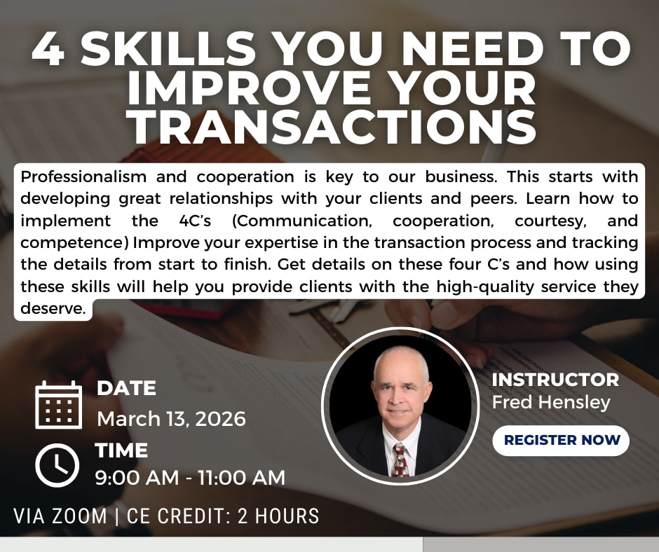 Professionalism and cooperation is key to our business. This starts with developing great relationships with your clients and peers. Learn how to implement the 4C’s (Communication, cooperation, courtesy, and competence) Improve your expertise in the transaction process and tracking the details from start to finish. Get details on these four C’s and how using these skills will help you provide clients with the high-quality service they deserve.