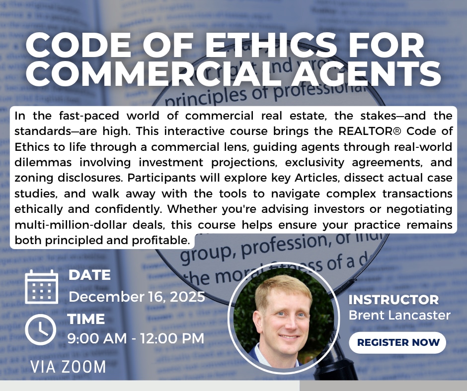 In the fast-paced world of commercial real estate, the stakes—and the standards—are high. This interactive course brings the REALTOR® Code of Ethics to life through a commercial lens, guiding agents through real-world dilemmas involving investment projections, exclusivity agreements, and zoning disclosures. Participants will explore key Articles, dissect actual case studies, and walk away with the tools to navigate complex transactions ethically and confidently. Whether you're advising investors or negotiating multi-million-dollar deals, this course helps ensure your practice remains both principled and profitable.