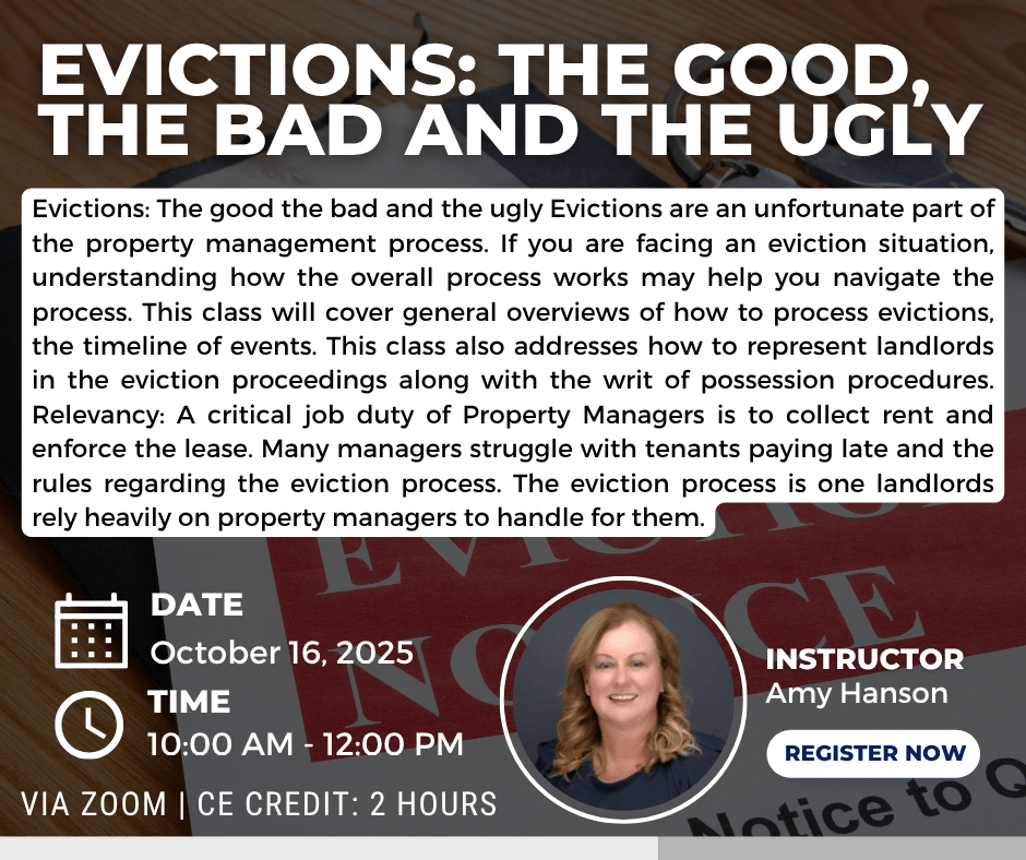 Evictions: The good the bad and the ugly Evictions are an unfortunate part of the property management process. If you are facing an eviction situation, understanding how the overall process works may help you navigate the process. This class will cover general overviews of how to process evictions, the timeline of events. This class also addresses how to represent landlords in the eviction proceedings along with the writ of possession procedures. Relevancy: A critical job duty of Property Managers is to collect rent and enforce the lease. Many managers struggle with tenants paying late and the rules regarding the eviction process. The eviction process is one landlords rely heavily on property managers to handle for them. Course outline