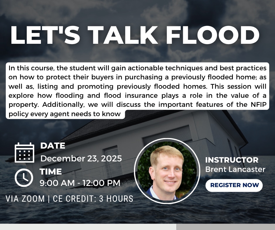 In this course, the student will gain actionable techniques and best practices on how to protect their buyers in purchasing a previously flooded home; as well as, listing and promoting previously flooded homes. This session will explore how flooding and flood insurance plays a role in the value of a property. Additionally, we will discuss the important features of the NFIP policy every agent needs to know